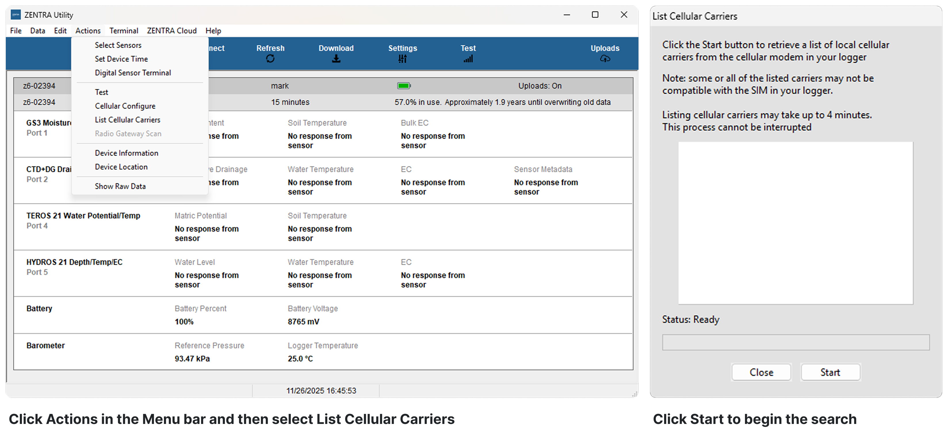 Queries the cellular module in the data logger for a list of carriers it detects. This is useful when trying to troubleshoot cellular connection problems.