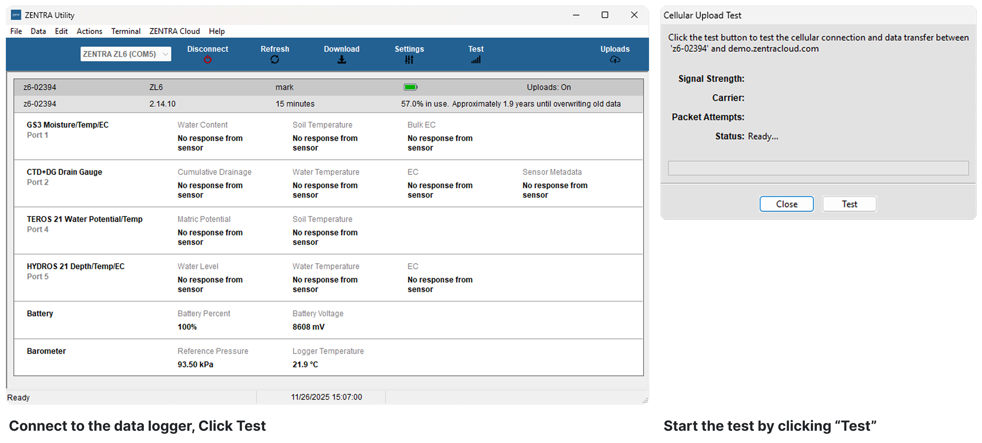 A successful communication test will confirm that the data logger can transmit data to ZENTRA Cloud, as well as provide a connection quality rating. Even a poor connection status allows data to be successfully transferred. Prior to installing the sensors and the data logger, check the connection status at the location.
