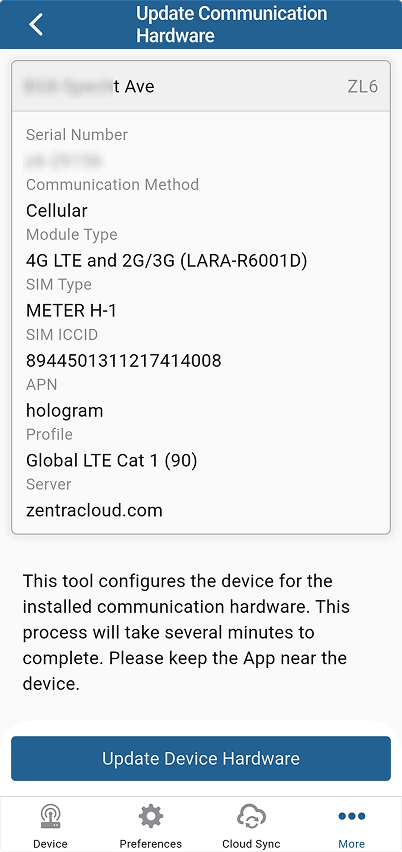The Update Communications Hardware screen will display the Module Type, SIM Type, and Profile configuration for the hardware.